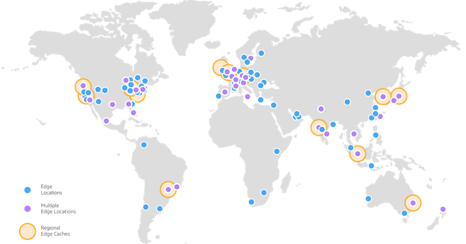 Esses são os pontos de borda da rede da AWS. Dependendo do serviço da AWS utilizado, esses pontos de presença serão os pontos de entrada da rede da AWS. Quanto mais rápido colocarmos o cliente dentro da rede da AWS mais rápida será a resposta do nosso serviço para eles, visto que a rede interna da AWS possui uma velocidade altíssima. Serviços como CloudFront, Amazon Route 53, AWS Global Accelerator utilizam esses pontos de presença que não necessariamente estão dentro de uma região ou zona de disponibilidade. Esses pontos estão distribuídos pelo mundo e muitos com parceria com os provedores de serviço de internet, como Claro, Vivo, Tim e outros. Isso facilita e gera uma entrada mais rápida para a rede da AWS. Muitos desses pontos de presença também atuam como cache, que irá deixar nossos sites que são disponibilizados através do CloudFront (CDN - Content delivery network), por exemplo, mais próximos dos clientes. Se seu site estiver hospedado no Brasil e um cliente do Japão realizar o primeiro acesso, então a requisição chegará até o Brasil e depois a resposta voltará até o Japão para que o cliente visualize seu site. Contudo, se ele realizar um novo acesso, o tempo resposta será muito mais rápido, pois o serviço de CloudFront buscou um ponto de presença mais próximo do Japão e deixou os arquivos do seu site armazenados por lá (cache), assim dessa vez não será mais necessário ir até o Brasil, é só buscar os arquivos do seu site nesse ponto de presença mais próximo do Japão que pode ser até dentro do próprio país, ou seja, seu site está no Brasil mas o cliente acessará um ponto do Japão, o que garante um tempo de resposta mais rápido. Abaixo está a imagem dos pontos de presença distribuídos pelo mundo. -