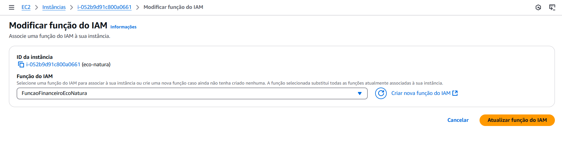 Agora que temos a função criada, precisamos atribuí-la à instância EC2 para que ela possa ter acesso ao bucket eco-natura-financeiro do S3.