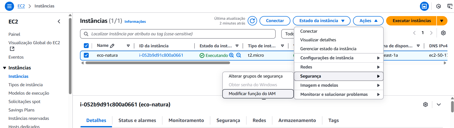 - 3. Ir em ações -> segurança -> modificar função do IAM, conforme imagem abaixo