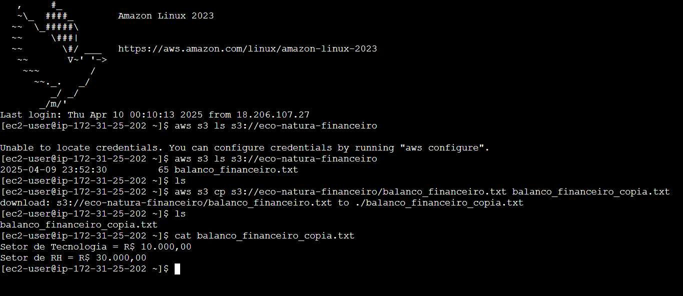 - Associei a função FuncaoFinanceiroEcoNatura e realizei o mesmo comando que lista objetos do bucket para demonstrar que agora o objeto balanco_financeiro.txt é listado, ou seja, o acesso da EC2 ao S3 foi permitido por causa da função associada.